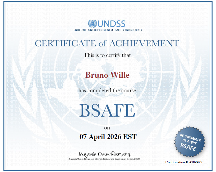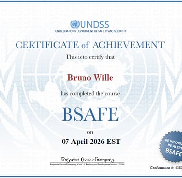 A integração da certificação BSAFE, emitida pelo Departamento de Segurança das Nações Unidas (UNDSS), eleva o conhecimento consolidado da Wille & Company a um patamar de Interoperabilidade Global.